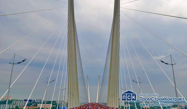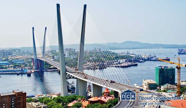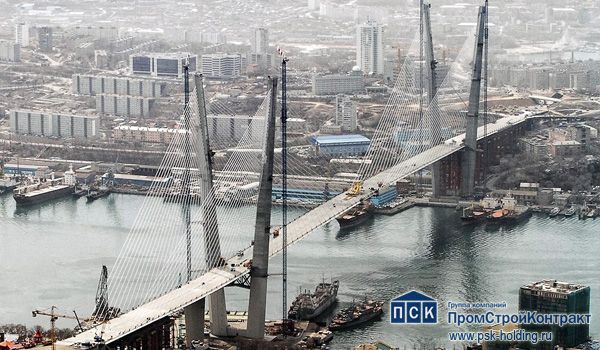 Вантовый мост через бухту Золотой Рог — один из двух мостов во Владивостоке, построенных в 2008-2012 г. в рамках программы подготовки города к проведению саммита АТЭС. Длина моста составила 1 388,09 м Протяжённость мостового перехода по основному створу — 2,1 км Схема мостового перехода 49,98+2х90+100+737+100+2х90+41,94 м в виде вантового двухпилонного пролётного строения. Ванты расположены по схеме веер. Число полос движения — 6 Габарит проезжей части 9,5+1+9,5+2х4,25 м Подмостовой габарит по высоте — 64,25 м Главный пролёт — 737 м Высота пилонов от уровня ростверков — 226,25 м Размеры железобетонной плиты под пилон — 36х64х12 м Всего длина эстакад, подходов — 331,2 м Габарит — 9,65х2+0,7х2 м Общая площадь эстакад — 7 510 м2 Площадь проезжей части — 76 300 м2 Площадь тротуаров и пешеходных дорожек — 65 759 м2 , в том числе: с покрытием из искусственного камня — 11 000 м2 с асфальтобетонным покрытием — 14 878 м2 Общая площадь благоустройства — 188 800 м2 Проектом было предусмотрено строительство автодорожного тоннеля под четыре полосы движения — две полосы в прямом направлении и две — в обратном. Длина тоннеля — около 250 м. Продукты и услуги: опалубочные системы PSK-CUP, сейсмоустойчивые технологии механического соединения арматуры, технологии преднапряжения, бетонораспределительная техника SANY